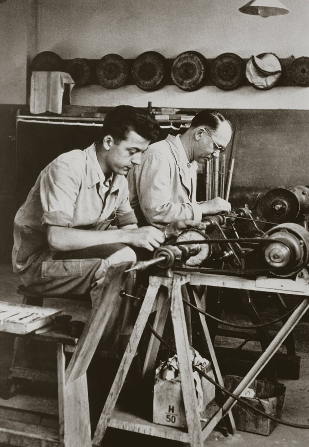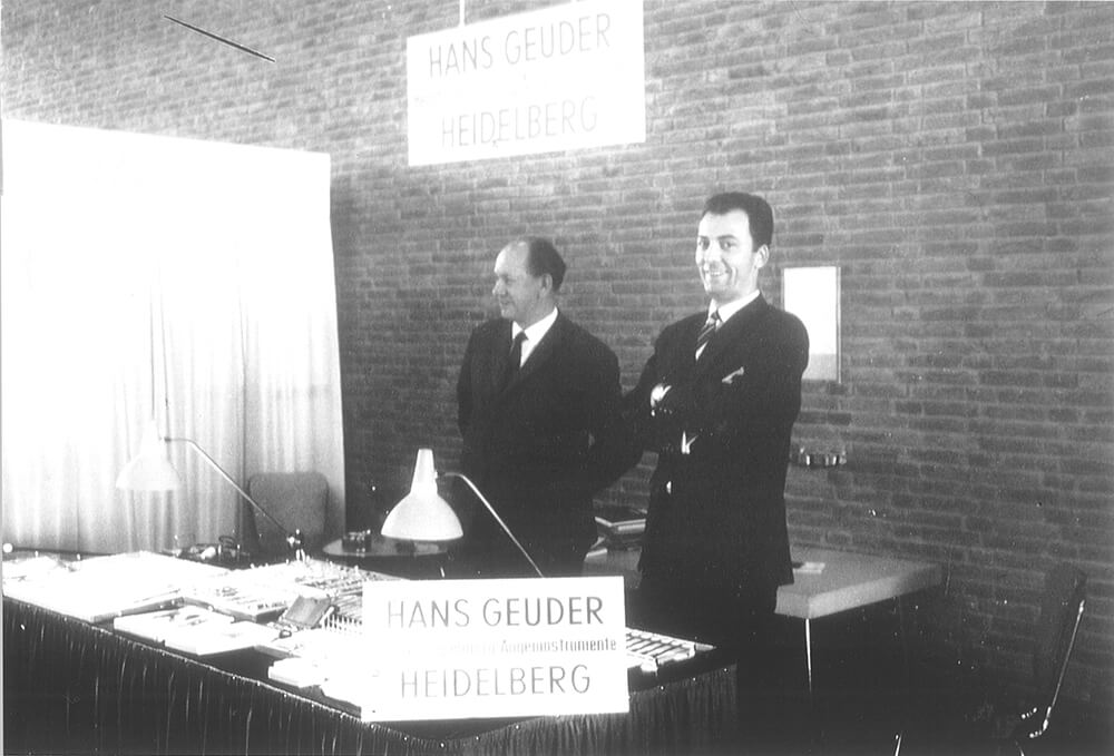 Hans Geuder senior gründet die Firma „Hans Geuder“ in einer Werkstatt in Heidelberg-Handschuhsheim. Auf diesem Bild bearbeiten Hans Geuder senior und junior chirurgische Instrumente auf dem Schleifbock.