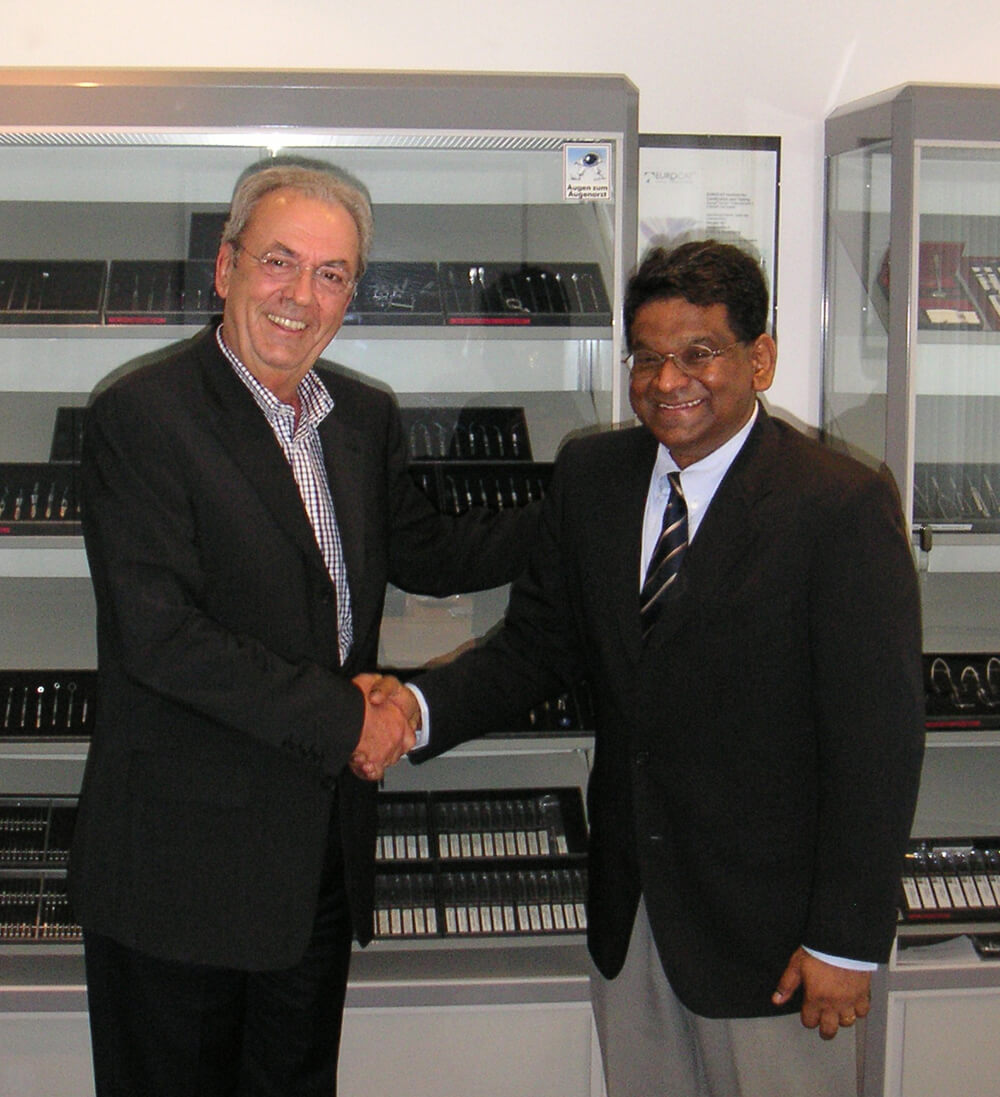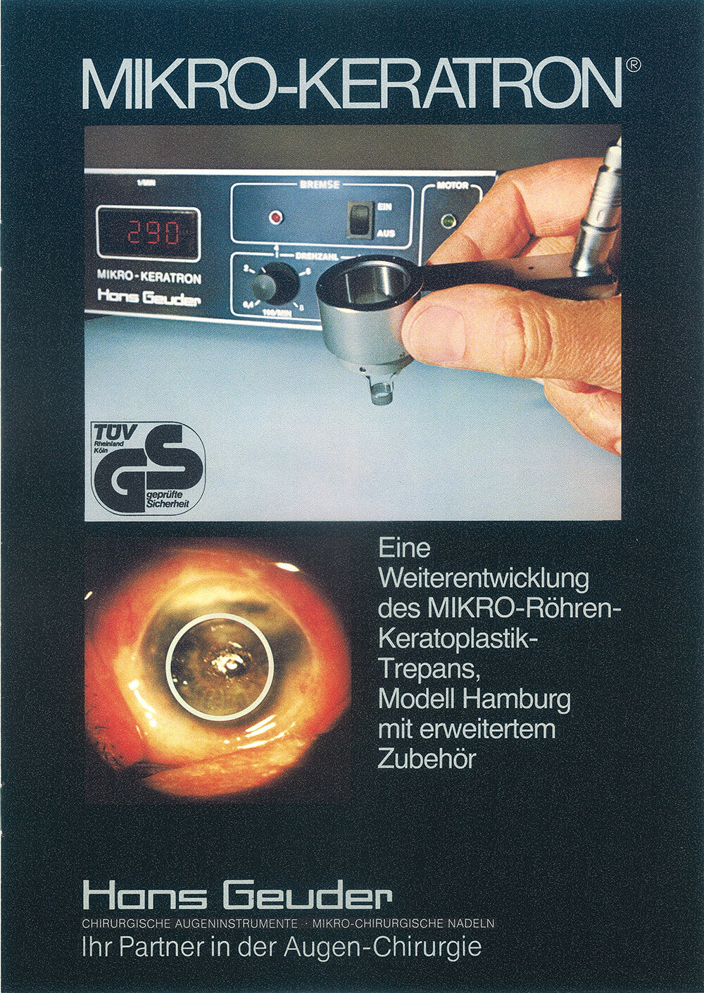 Mit dem MIKRO-KERATRON® bringt Geuder in Kooperation mit Prof. G.O.H. Naumann, Erlangen, und Prof. U. Demeler den ersten Motor-Trepan mit optischer Kontrolle zum motorgesteuerten Schneiden der Hornhautlamelle auf den Markt. Die Präzision der Schnitte ist damit um ein Vielfaches höher als mit den bis dato eingesetzten Hand-Trepanen.