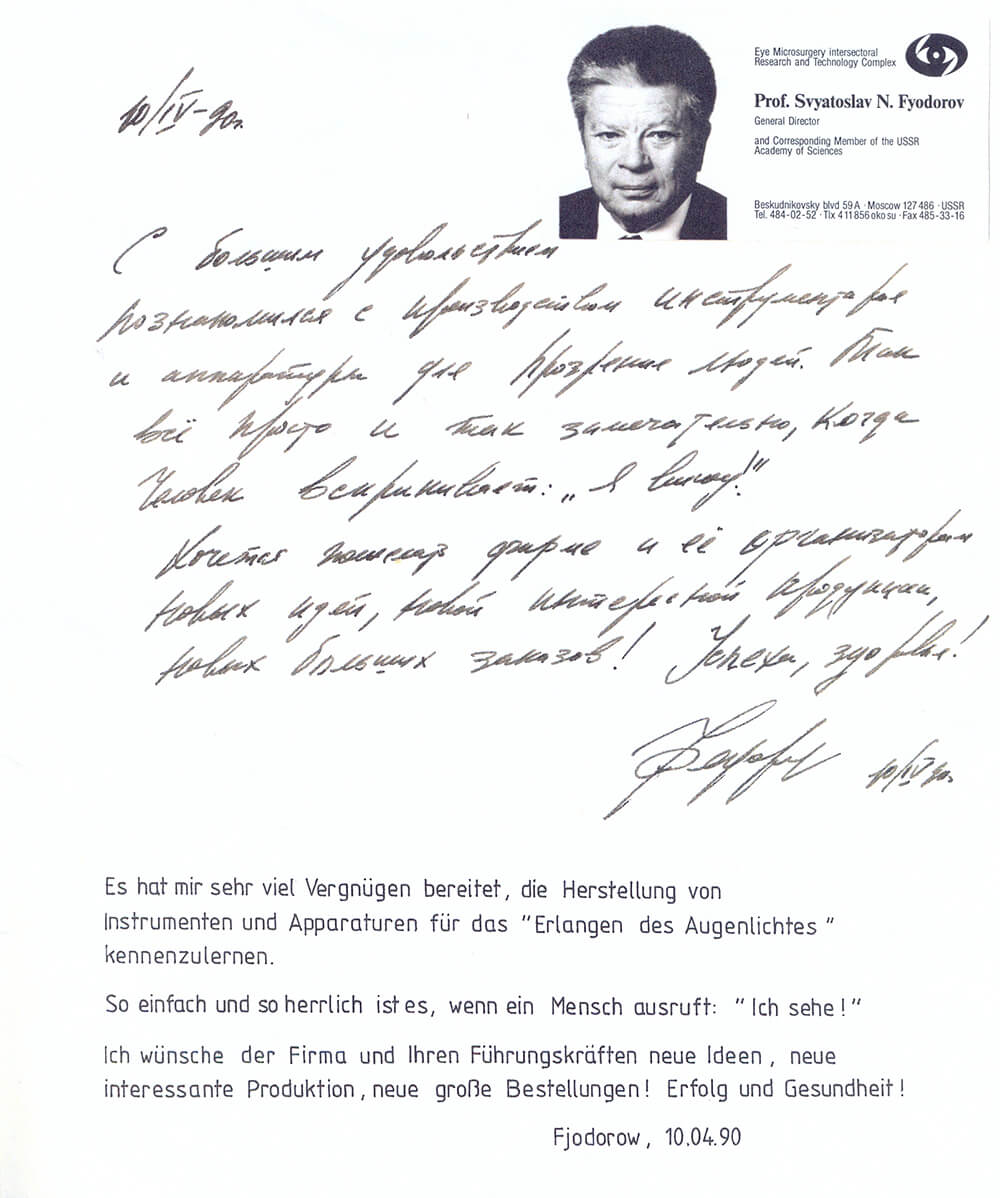 S.N. Fjordorov entwickelt die nicht-penetrierende tiefe Sklerektomie bei Offenwinkelglaukom. Mit Prof. Fjodorov verbindet Geuder eine langjährige Freundschaft und fruchtbare Zusammenarbeit.
