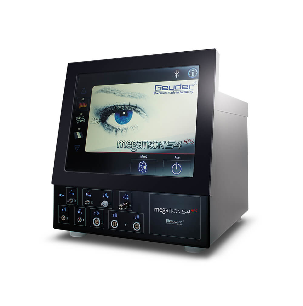 Mit dem Megatron® S3 führt Geuder das erste Gerätesystem für den Vorder- und Hinterabschnitt mit Touch-Screen ein. Zu den weiteren Besonderheiten zählt die duale Pumpe (Peristaltik und Venturi-Effekt) sowie der individuell programmierbare Fußschalter.