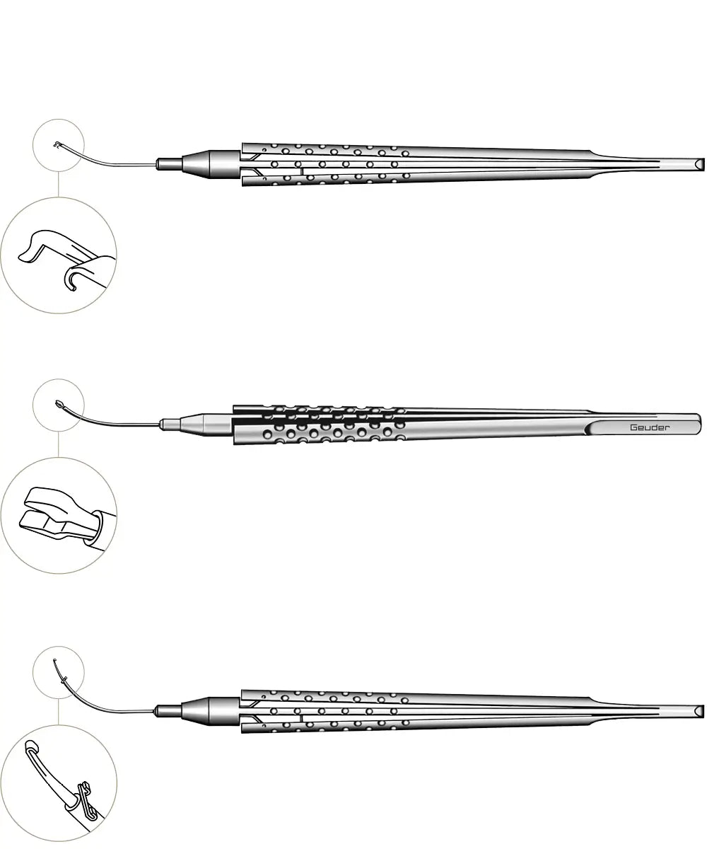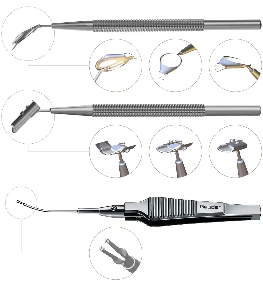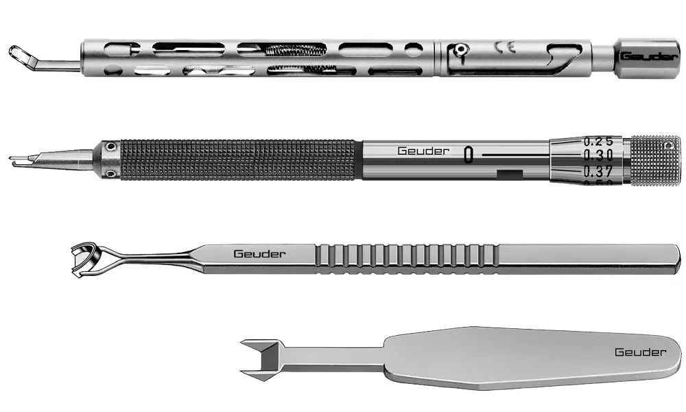 Für eine effektive IOL-Explantation durch kleinste Inzisionen entwickelt Geuder in Zusammenarbeit mit M.E. Snyder und R.H. Osher (Cincinnati Eye Institute) eine IOL-Schere und ein IOL-Zängchen. Die IOL-Schere nach Snyder/Osher hat kräftige und scharfe Scherenblätter sowie Riefen auf dem unteren Schneideblatt, um ein Vorgleiten der Linse beim Schneiden zu verhindern. Außerdem ergibt sich durch die besondere Griff-Geometrie ein großer Öffnungswinkel der Scherenblätter. Das IOL-Zängchen nach Snyder/Osher bietet durch speziell geriefte Fassflächen einen sicheren Halt für die Linse beim Zerteilen und die Linsenfragmente beim Entfernen.