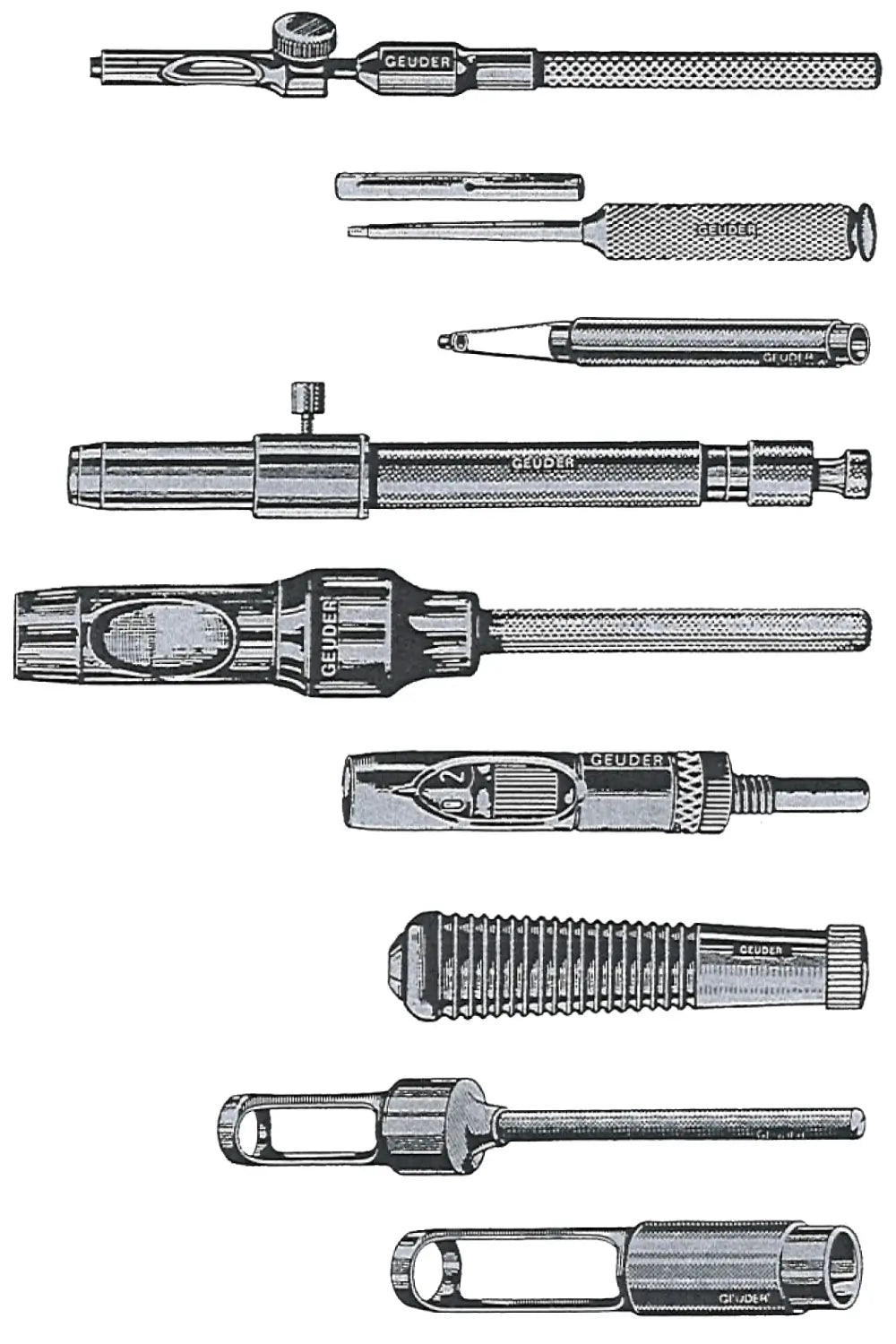 C. Binkhorst erfindet die erste Iris-fixierte IOL zum Ausgleich der Aphakie nach intrakapsulärer Staroperation. 1977 vereinfacht J. Worst die Iris-Fixierung mit der Iris-Claw-Linse weiter. Zur atraumatischen Implantation dieser IOLs führt Geuder diverse Pinzetten ein.
