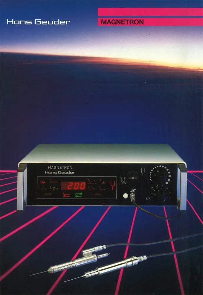 Mit dem MAGNETRON, einem elektronischen Steuergerät für Magnet- und Motorinstrumente führt Geuder erstmalig eine Vitrektomie-Maschine ein. Über einen 8-fachen Stufenschalter können u.a. Vitrektomie- und Glaskörper-/Netzhaut-Schaltprogramme zur Steuerung der magnetischen VITREOTOME und VITREO-CUTTER ausgewählt werden. Die Geschwindigkeit der Bewegungsimpulse ist durch einen Potentiometer oder Fußschalter bis zu dem auf der Digitalanzeige voreingestellten Wert regelbar. Die Vitrektomie wird 1978 als neu etabliertes Verfahren zur Entfernung epiretinaler Gliosen eingesetzt und die Pars-Plana Vitrektomie erstmals 1991 bei Makulaforamen, aber erfunden wurde die Vitrektomie bereits 1971. R. Machemer revolutionierte damit die Glaskörper- und Netzhautchirurgie, indem er durch ein geschlossenes System den Druckabfall im Auge weitgehend eliminierte und die Komplikationsrate reduzierte.