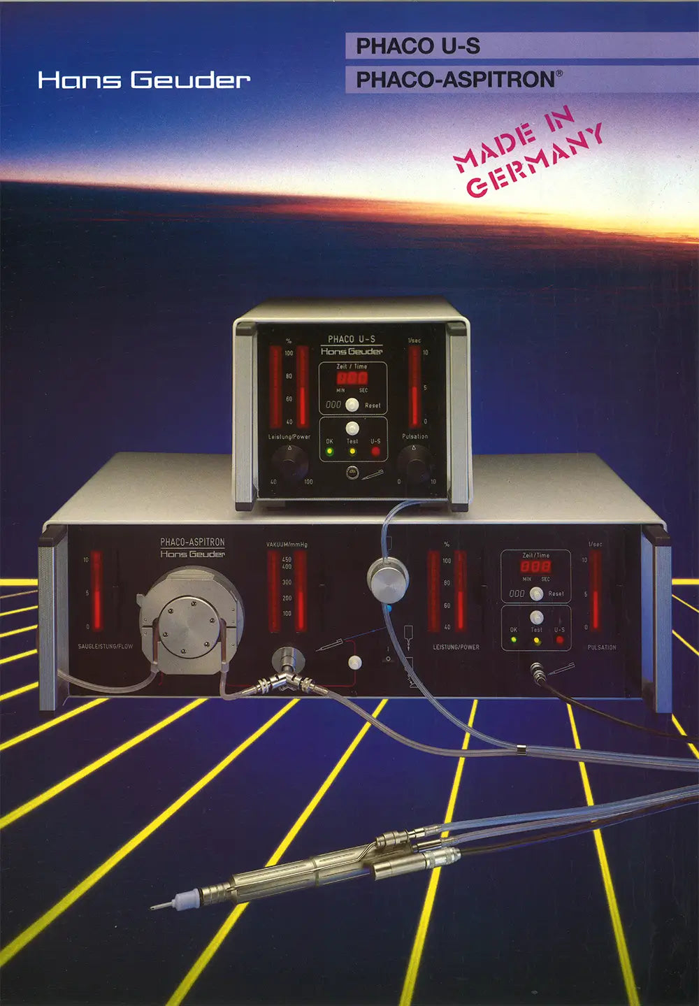 C. Kelman entwickelt das Verfahren der Phakoemulsifikation, die Katarakte mittels Ultraschall emulsifiziert und aspiriert. Da die Phako in Deutschland erst ab den 1980er Jahren Einzug in die klinische Routine hält, bringt Geuder 1983 mit dem PHACO U-S seinen ersten Ultraschallgenerator auf den Markt. Die Phakoemulsifikation erlaubt kleinere Inzisionen, wodurch eine schnellere Wundheilung und Visuserholung eintritt sowie Wundleckagen und unbeabsichtigten Filterkissen reduziert werden.