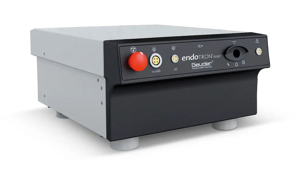 Mit dem endoTRON® 532 nm grünen Laser zur Photokoagulation wird das Gerätesystem für den Hinterabschnitt komplettiert. Der Endolaser kann auf zwei Weisen gesteuert werden: a) integriert über das megaTRON® S4 HPS oder b) unabhängig (stand-alone) über eine eigene Bluetooth-Fernbedienung mit Touchscreen.